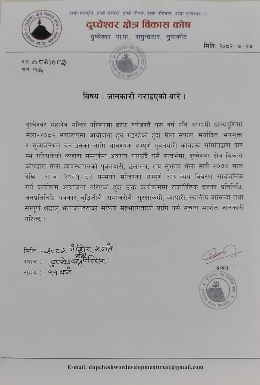 नुवाकोट । नुवाकोटको दुप्चेश्वर गाउँपालिका वडा नम्बर ६ स्थित दुप्चेश्वर महादेव मन्दिर परिसरमा हरेक वर्षझैँ यस वर्ष पनि धान्यपूर्णिमा अवसरमा भव्य मेला आयोजना गरिने भएको छ । धार्मिक, सांस्कृतिक तथा पर्यटकिय सम्भावनाले सम्पन्न दुप्चेश्वर महादेव मन्दिर परिसरमा यस वर्ष धान्यपूर्णिमाका अवसरमा भव्य मेला लाग्दैछ । दुप्चेश्वर क्षेत्र विकास कोषले सार्वजनिक गरेको सूचना अनुसार मेलालाई सफल, मर्यादित, भव्य र व्यवस्थित बनाउनका लागि आवश्यक पूर्वतयारी कार्य तीव्र रूपमा अघि बढाइएको छ।